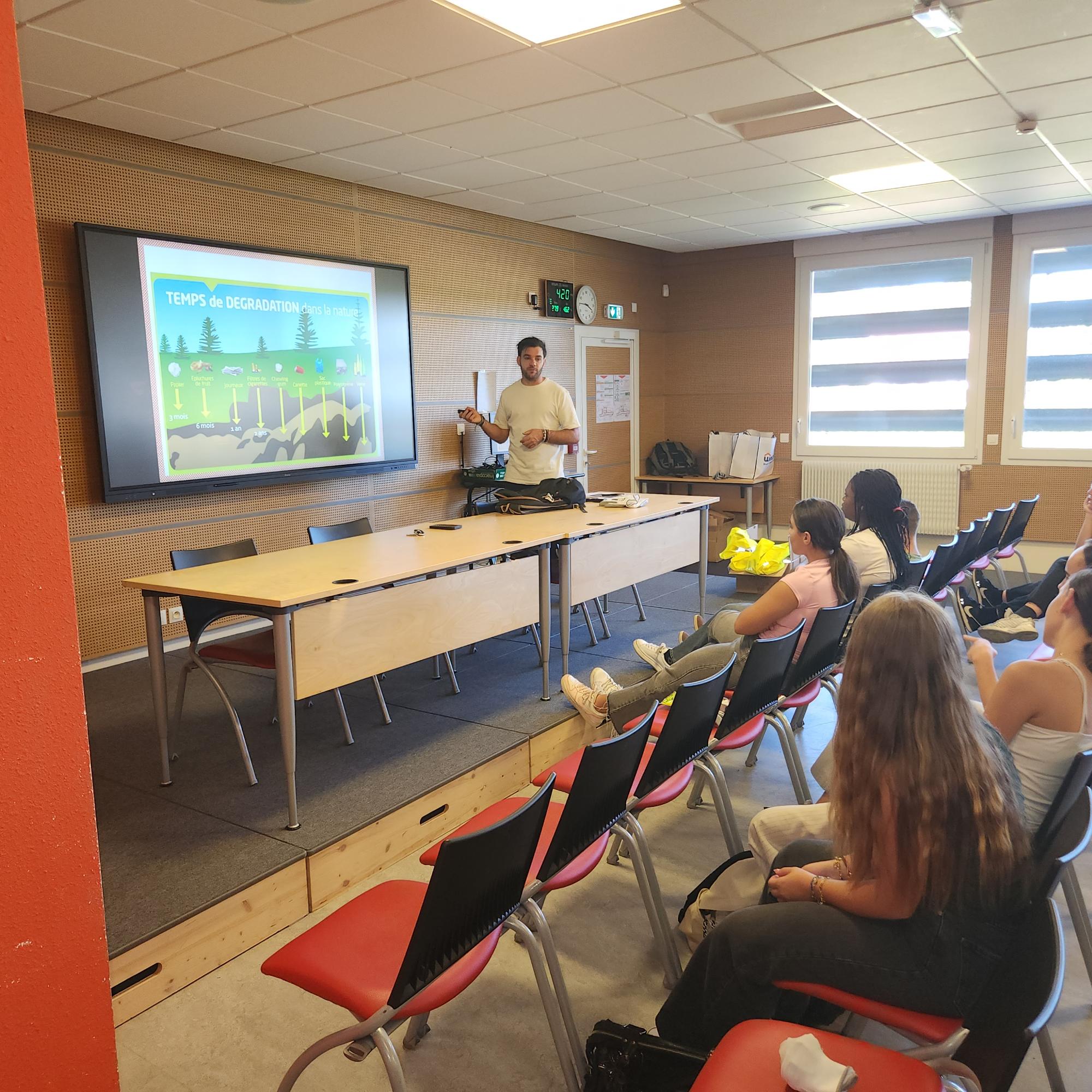 De retour au lycée, Maxence du SICTOM est intervenu pour faire le point sur le contenu de nos poubelles, le tri dans les différents bacs et le possible recyclage de certains déchets.